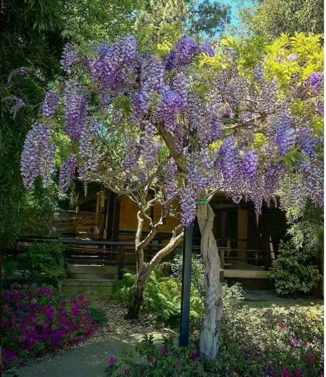 紫藤常被种植在湖边、水池、假山、石广场等地。它有独特的风格,盆景也是常用的。