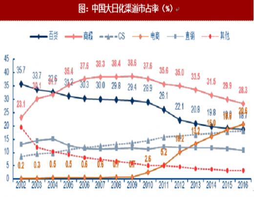 自2004年以来,超市渠道是日化产品最重要的渠道。中国工业信息网数据显示,2009年尚超渠道在日化市场的份额达到38.6%的峰值,2010年后一路下滑,但2015年仍有近30%的份额。