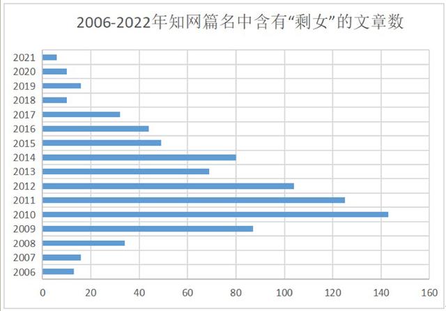 为了了解“剩女”一词的流行情况,笔者在中国知网上搜索“剩女”,发现这类文章最早出现在2006年,之后逐渐增多,2010年达到高峰(143篇)。此后呈不规则下降趋势,但大致在2011-2017年保持了一定的热度。2019年以后,会逐年减少。到2021年,将只有6条。可以看出热点话题已经过去了(见下图)。虽然统计数据只涉及媒体报道和学术研究,但也在一定程度上反映了网络舆情的变化。