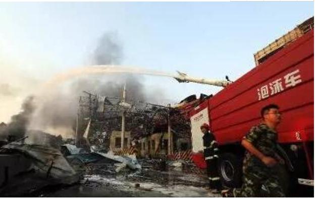 天津港发生火灾爆炸后,消防人员迅速反应,来到现场灭火。到8月13日上午8点,爆炸已经发生了8个多小时,天津港的大火仍然没有完全扑灭。事故现场有6个大火点,十几个小火点。消防队员不得不把火点分开,埋在沙子里灭火,所以花了很长时间才把火扑灭。