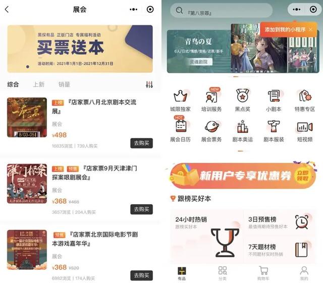至于小程序,小黑滩的两款产品虽然都属于服务型平台,但是在定位上有一定的区别。比如《有品黑探》的客户端就更倾向于企业,其中剧本杀店主可以在市内购买盒装甚至独家剧本。同时,平台还提供一些行业展览、剧本、服装、道具等服务。