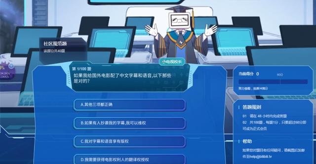 社团题一般都是无脑题,就像我们初中的思政课一样。比如看视频的正确方法是什么?在游戏区看视频时,弹幕符合礼仪等。,而且即使错了,也可以重新选择这些题,直到输入正确,也就是说这些题完全可以得满分。分值为40分,也就是说只要在最后的60分中答对20题就可以成功晋级。