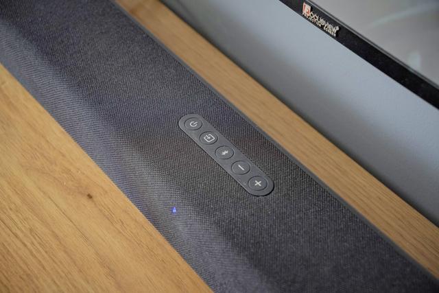 回音壁顶部有五个按钮,分别是开/关、模式切换、蓝牙、音量减小和音量增大。还可以通过遥控实现更多功能。