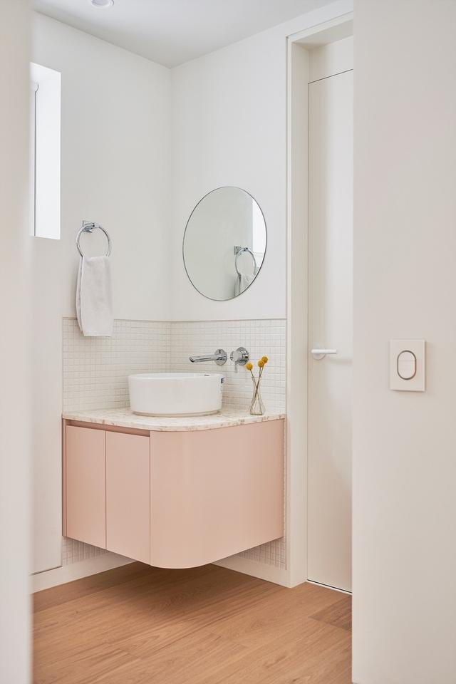 对了,一楼有公共厕所。盥洗台特意移出,布置在角落,扩大了空的使用空间,提高了干湿分离。而且粉色挂空洗脸台颜值超高。