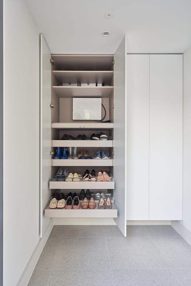 衣柜打开后,你会发现内部隔断是活动的,可以根据鞋子的高度来调节层高,比如靴子和高跟鞋。