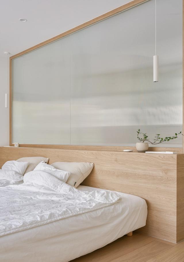 床的背景墙不是实心墙,而是用木头和玻璃做成的轻质墙,后面是5米多长的更衣区。