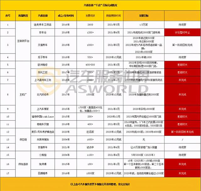 从“2021年前锁定9家汽修公司,但未能实现其千店目标”的结果来看,汽修行业的千店连锁之路目前看来可以称得上是小败。
