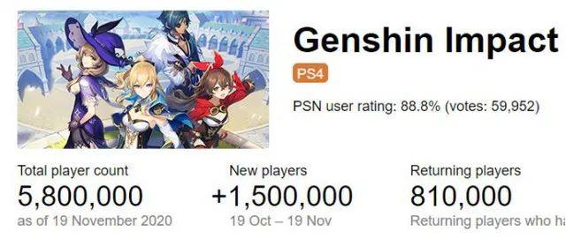 据第三方数据显示,去年11月,PS4平台《原神》预约用户数突破580万,不久这一数字突破600万。虽然这与该游戏在PC或移动端的用户数量相比相形见绌,但与其他PS主机游戏相比,这个量级并不低。