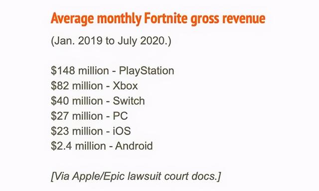 与《原神》类似,Epic的《堡垒之夜》实现了从主机到移动端的数据交换。庭审中,一份Excel文件列出了Epic旗下游戏在所有平台的月收入,其中《堡垒之夜》在过去一年半的时间里收入3.22亿美元,最大的收入来源是PlayStation。