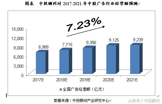 基于上述因素,中投顾问发布的《2017-2021年中国广告行业投资分析及前景预测报告》预计,2017年中国广告行业业务规模将达到6989亿元,未来五年(2017-2021年)年均复合增长率为7.23%,2021年业务规模为9239亿元。