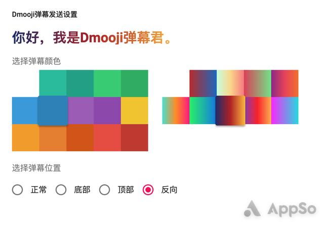 点击开头的字体设置,可以对弹幕颜色和位置进行选择。15 款纯色弹幕、9 款渐变弹幕、还有反向弹幕可供选择,个性化的设置让你的弹幕脱颖而出!