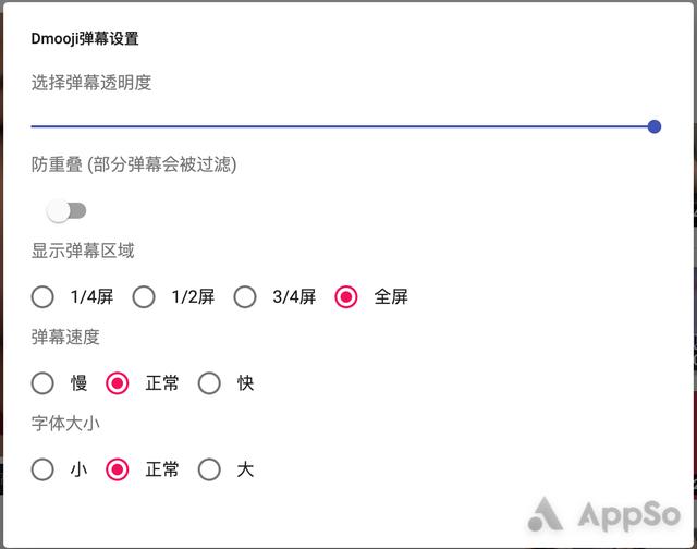用户还可以对弹幕做进一步调整,比如透明度、速度、字体大小等,还可以过滤掉重复的弹幕。
