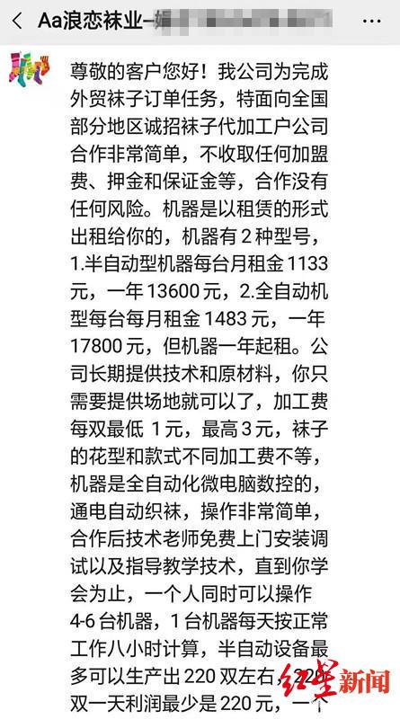 红星新闻记者注意到,在微信上,对方称公司为了“完成外贸订单任务”,“为加工户招聘袜子”,随后对方介绍了“合作”方式,即向加工户租赁机器,“公司提供技术和原材料”,“技术老师上门安装调试,免费指导教学技巧”。“我觉得我有东西可赚了。”张先生很感动。