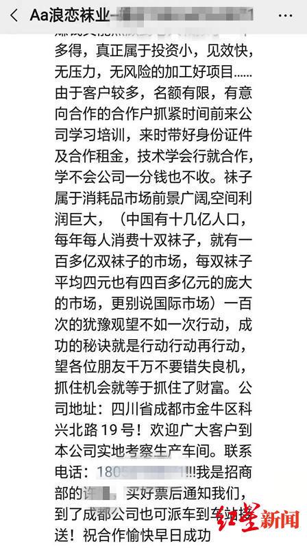 四川广安的张先生在福建打拼30多年后,回到了家乡。在照顾孩子的同时,他和妻子还打算做点挣钱的事情。在搜索中,张先生看到9月左右有一个名为“成都朗莲袜业”的促销活动。经过协商,他加了一个工作人员的微信。
