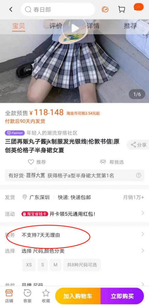根据消费者提供的线索,福建省消委会调查发现该网红品牌在微博、小红书商城、淘宝都有经营店,网店均有标注“不支持7天无理由”。