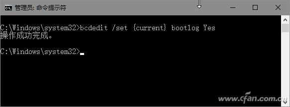 我们首先可以使用BCDEDIT命令来开启ntbtlog.txt。进入管理员命令提示符窗口,执行BCDEDIT命令,记下Windows启动加载器的标识符{current}(图1)。
