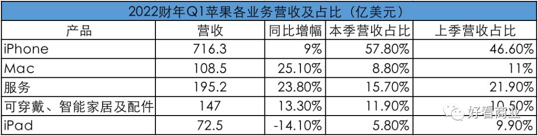 2022财年Q1,iPhone营收716亿美元,同比增长9%,营收占比从上一季度的46.6%提升至57.8%。作为苹果最大的收入来源,iPhone热销也带动公司整体营收和利润大涨。