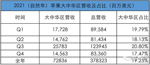整个2021自然年,大中华区为苹果公司贡献了总计超19.25%的营收。
