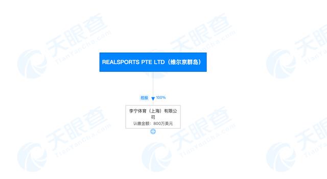 另外一家李宁体育(上海)有限公司的疑似实际控制人、最终受益人为REALSPORTS PTE LTD(维尔京群岛),后者对前者100%控制,认缴金额800万美元。