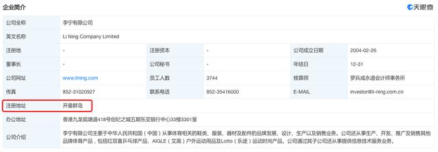 天眼查显示,李宁有限公司(HK.02331)成立于2004年2月26日,公司注册地址为开曼群岛。