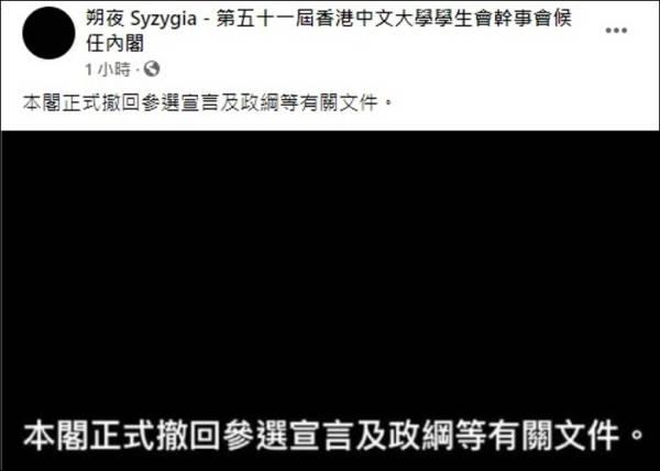 综合“东网”等港媒2月27日报道,新一届香港中文大学学生会干事会、候任“内阁”——“朔夜”,于27日凌晨在脸书上宣布,正式撤回参选宣言及政纲等有关文件。