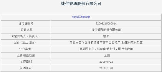 目前,雷军作为捷付睿公司法定代表人身份已经在央行网站更新,值得关注的是,在8月29日央行对第二批12家非银支付机构作出的续展决定中,捷付睿通股份有限公司获得五年期续牌,有效期为2011年5月至2016年5月2日。