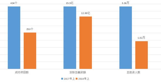 人创咨询统计,截至2018年6月底,全国共上线过众筹平台854家,其中正常运营的为251家,下线或转型的为603家;其中,股权型平台80家,权益型平台75家,物权型平台48家,综合型平台34家,公益型平台14家。与2017年同期相比,2018年上半年股权型总项目数有所增加,不过成功项目数、实际总融资额、总投资人次均有所减少,成功项目数减少了同比下降41.71%;成功项目实际总融资额同比下降16.22%;成功项目总投资人次减少了1.84万人次,同比下降54.74%。