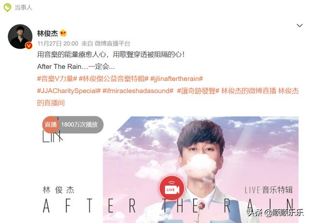 11月28日,林俊杰在微博唱给你听,点击进入直播间一起感受音乐的疗愈力量吧。林俊杰陪伴你度过一个温暖周末,用歌声唱响希望。用音乐的能量疗愈人心,用歌声穿透被阻隔的心! 心情也是每天起伏,遇见阴霾笼罩的日子,希望歌声能给大家力量,守住美好,整装向阳!