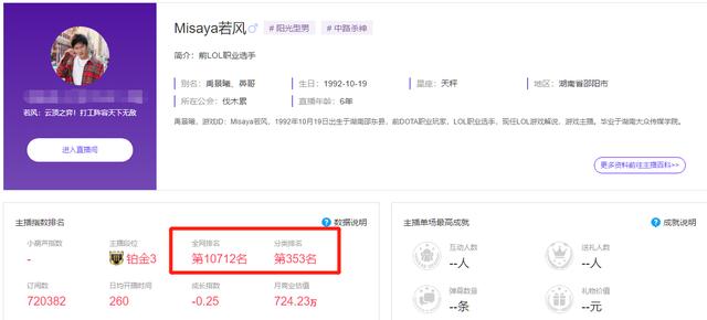 Misaya若风,前WE战队中单,素有“中路杀神”的称号,退役后做解说、主播。很多LOL玩家对若风并不会感到陌生,依然有很多观众会关注若风的直播。但是细心的人不难发现,以若风在英雄联盟里的影响力,他的直播间热度却显得有些尴尬。当初他加入企鹅电竞的时候,房间号88888,首播热度超过700万,现在的直播间热度却只有60万。