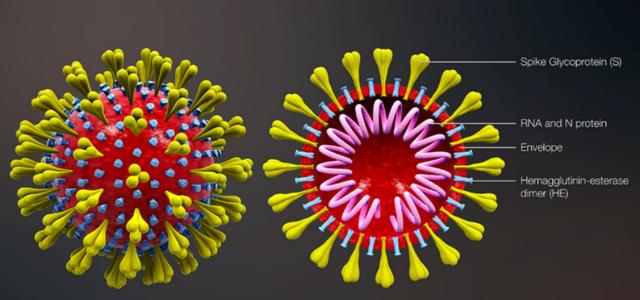 在冠状病毒的结构中,像皇冠一样的刺突称为刺突糖蛋白(Spike Glycoprotein,以下简称 S 蛋白),是结合人体细胞上相应受体的罪魁祸首;E 蛋白是包膜蛋白,将病毒内部的遗传物质包裹起来;还有膜蛋白(M 蛋白)和核衣壳蛋白(N 蛋白)等结构。