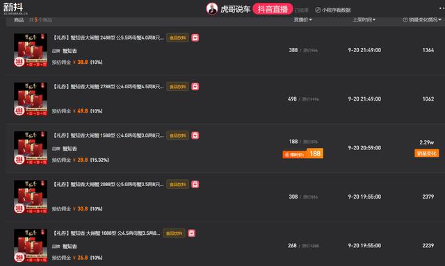 蟹知香出现在明星戚薇的抖音直播带货首秀,当场销售40万。在虎哥说车、扬叔来了、于震等头部红人、明星直播间,蟹知香还有多种规格的大闸蟹供用户选择,虎哥说车更是在9月20日,为蟹知香做了一场大闸蟹品牌专场。