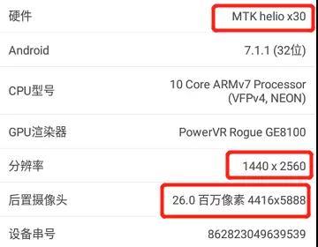 打开安兔兔,清晰地看到了手机搭载了十核联发科 X30,分辨率 1440×2560、26 百万像素后置双摄,64+64GB 内存组合,5800mAh 超大容量电池。