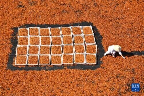 9月22日,在湖南省衡阳市衡东县吴集镇,农民在晾晒辣椒。新华社记者 赵众志 摄