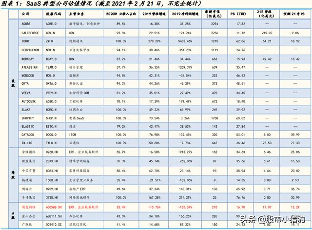 参考海外 SaaS 公司,Salesforce(2068.17亿、11x),Shopify Inc(1438.56亿,60x),Zoom Video(1148.66亿,58x),SAP SE(1517.79亿、5x),ServiceNow(1080.71亿,26x),市值数据截止到北京时间12月18号,单位都是美元,x为ps倍数。