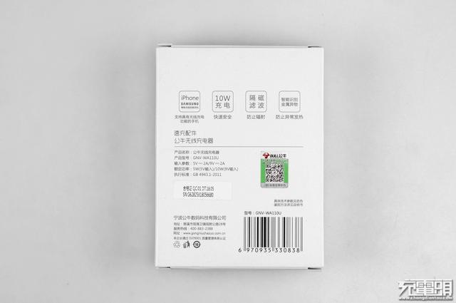 公牛GNV-WA110U无线充电器采用四方形纸盒包装,产品外壳上标注了支持苹果、三星等手机的无线充电、最大10W无线快充输出、隔磁防辐射、智能识别金属异物等产品特点。