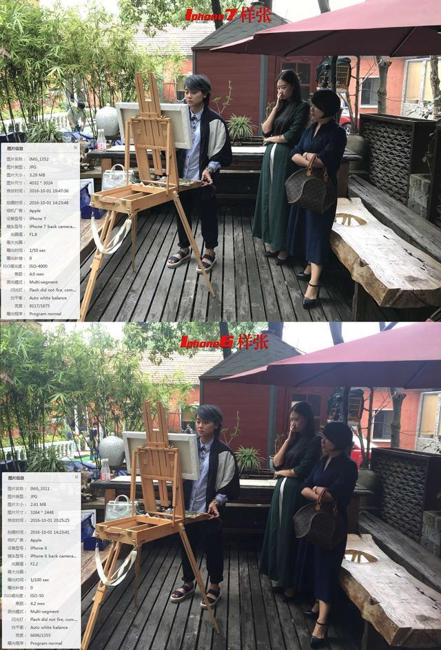 ▲ 拉近看的话iPhone7的优势就体现出来了,细节尤为清晰。iPhone6的涂抹感就比较强烈,仔细看两者头发,iPhone7拍摄的更加清楚自然,暗处的表现也不像iPhone6直接雾蒙蒙的一笔带过。但是有利必有弊,远处白色幕布上的字体却是iPhone6要清晰点,iPhone7远景上有点过曝和虚化。PS:画画的女士是我国写实派油画家冷军的前妻罗敏,冷军画了一副罗敏的油画拍出了3千万的高价。
