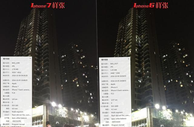 ▲ 夜景拍摄是测试重点,特意找了个对比反差大的楼房拍摄,局部截取也用的是最暗处的楼顶,样张表现上iPhone7依靠大光圈获得了大量的细节,iPhone6右边的矮楼房顶处基本看不见,iPhone7勉强还能看清楚。白平衡上不能说谁的比较准,只能说都比较接近。