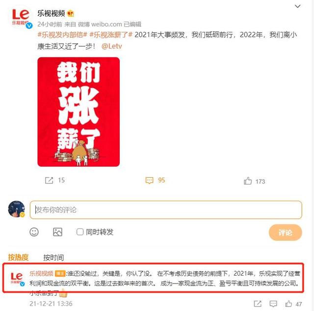 “2020年初疫情伊始,公司又不得不全员降薪和停发各种补贴,降薪幅度近10%。经过几年的调整,2021年乐视在不考虑历史债务影响的前提下实现了经营利润和现金流的双平衡。明年春节后,将恢复去年疫情时的全员降薪和补贴。”