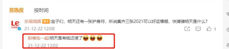 上游新闻记者也注意到,乐视视频官微中午又发布一条互动信息:“宝子们,明天还有一张护身符,听说集齐三张2021可以好运爆棚,快猜猜明天是什么?”一网友回复:“明天是有钱还债了。”