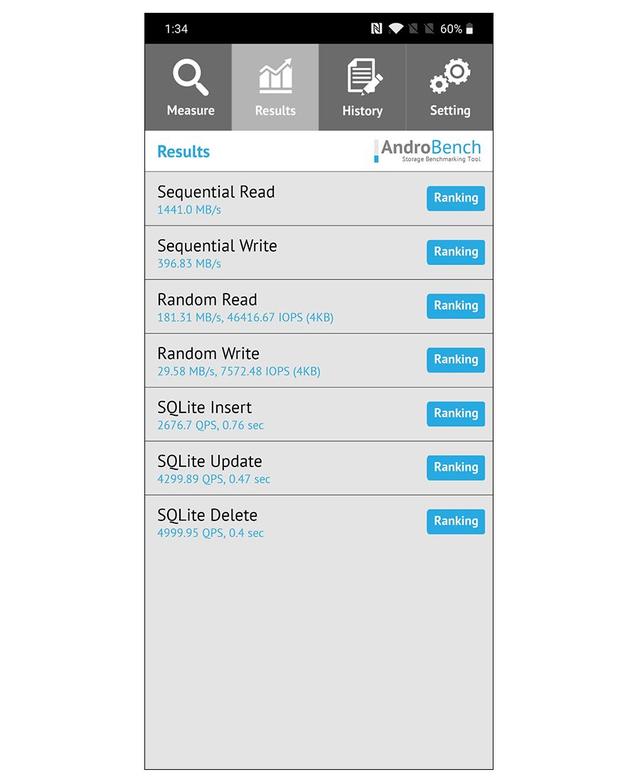 首先当然是所有存储器都共同的办法,测速,我们通常采用 AndroBench 来进行,其他可采用的工具还有 PCMark、A1 SD Bench 和 AndeBench 等等,不过用得不多,解读上不成体系,这里就不细讲了。