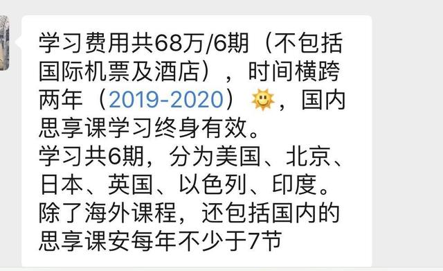 在公布的2019级课程安排中,高山大学学员将先后前往美国、日本、英国、以色列、中国、印度6地学习,也就是6期,每期学习时间为期7天。时间横跨2019、2020两年,从2019年3月初开始至2020年9月低结束。工作人员透露,6期学费共68万元,还包括国内思享课。