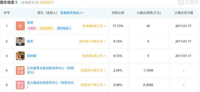 长长会管理顾问现有股东5名,大股东兼实际控制人为张明,持股比例为77.73%,认缴出资额为40万元,其次是雷军和蒋丽娟,持股比例均为9.72%,认缴出资额为5万元,认缴日期为2017年1月。此雷军,正是小米创始人。此外,股东还包括北京盛景丰盈创新投资中心(有限合伙)和昆山嘉成优选投资中心(有限合伙),分别注资1.16万元和0.31万元。