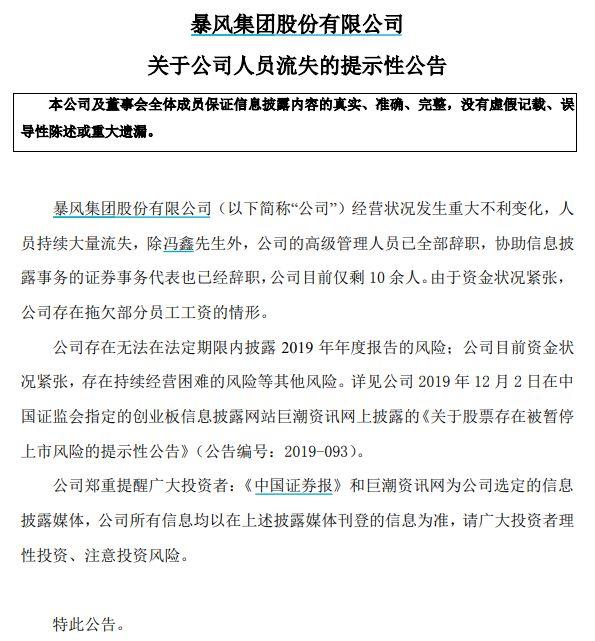 从今年7月开始,冯鑫涉嫌经济犯罪被控制后,暴风集团就坏消息不断,先是财报显示资产为负,随后又公布高管全部离职;再后来,公司无人,连正常的财务数据披露都无法继续,面临退市风险。