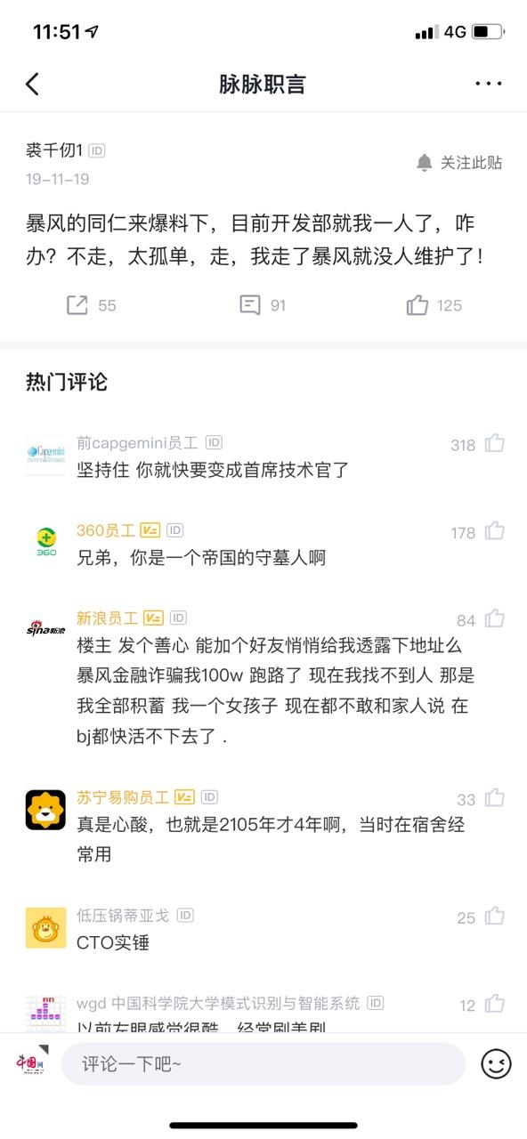 11月,脉脉上的一个匿名消息写道,“目前研发部就我一人了,咋办?不走,太孤单,走,暴风就没人维护了。”