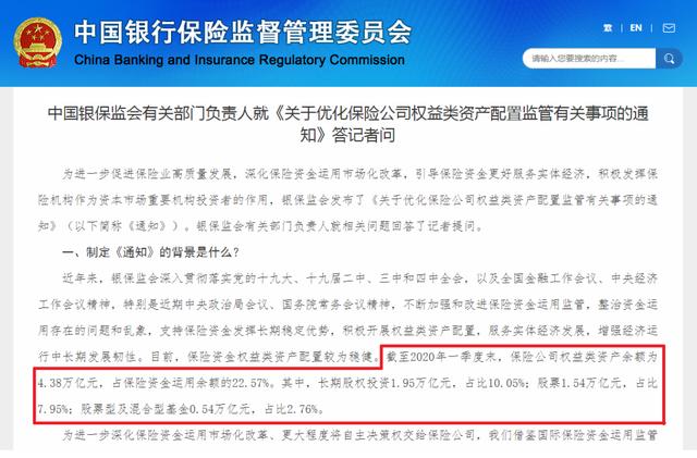 不过,散户们的想法似乎太直接了。提高上限就意味着万亿增量资金会入市吗?要知道,就在银保监会官网发布的这份公告里,在文章的第一部分就明确地列出了这么几组数据: