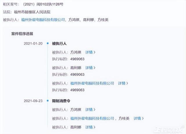 根据小弟的查看,目前外星科技的法人为方桂英,虽然同样是姓方但小弟没有查到直接二人关系的证据。不过小弟也注意到外星科技再2021年,同样触发了限制高消费记录,而被执行的又外星科技企业本身以及相应的高层,包括方鸿祺和方桂英。