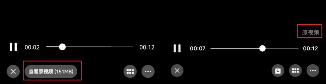 视频发送完成后,当对方点开视频播放,左下角还会有“查看原视频”的提示,而加载完成后播放还会在右下角显示该视频为“原视频”。
