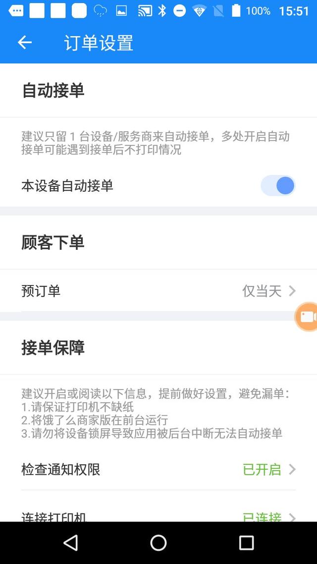 饿了么、美团、百度外卖可以分别在对应的 App 设置内开启自动接单功能,每个外卖应用都要求应用在前台运行时才能自动接单。