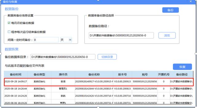 在“备份与恢复”界面中--点击“切换目录”--选择备份好的【开票软件数据备份】的文件夹--选中需要恢复的税号--点击“打开”按钮,最好选择最接近月份的自动备份数据或者是显示的第一条数据,即可恢复数据。