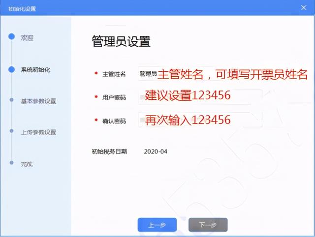【第二步】进入管理员设置界面,设置开票员姓名和用户密码,完成设置以后,点击“下一步”按钮;